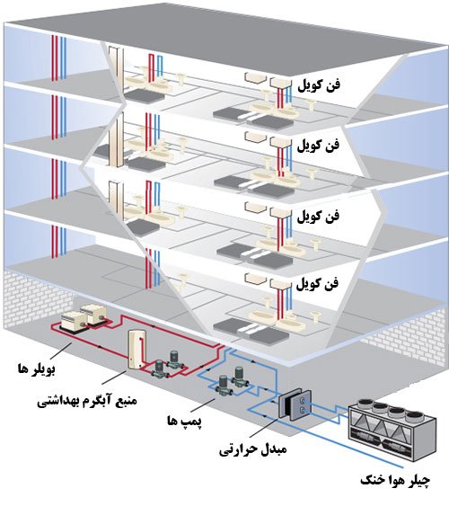 The above is in fact the most important generators of heating and cooling. In addition to these generators, equipment must be installed whose job is to exchange heat between cold water, hot water, or refrigerant with indoor air and regulate temperature, humidity control, air distribution at the appropriate speed and direction, and the most important of which are: